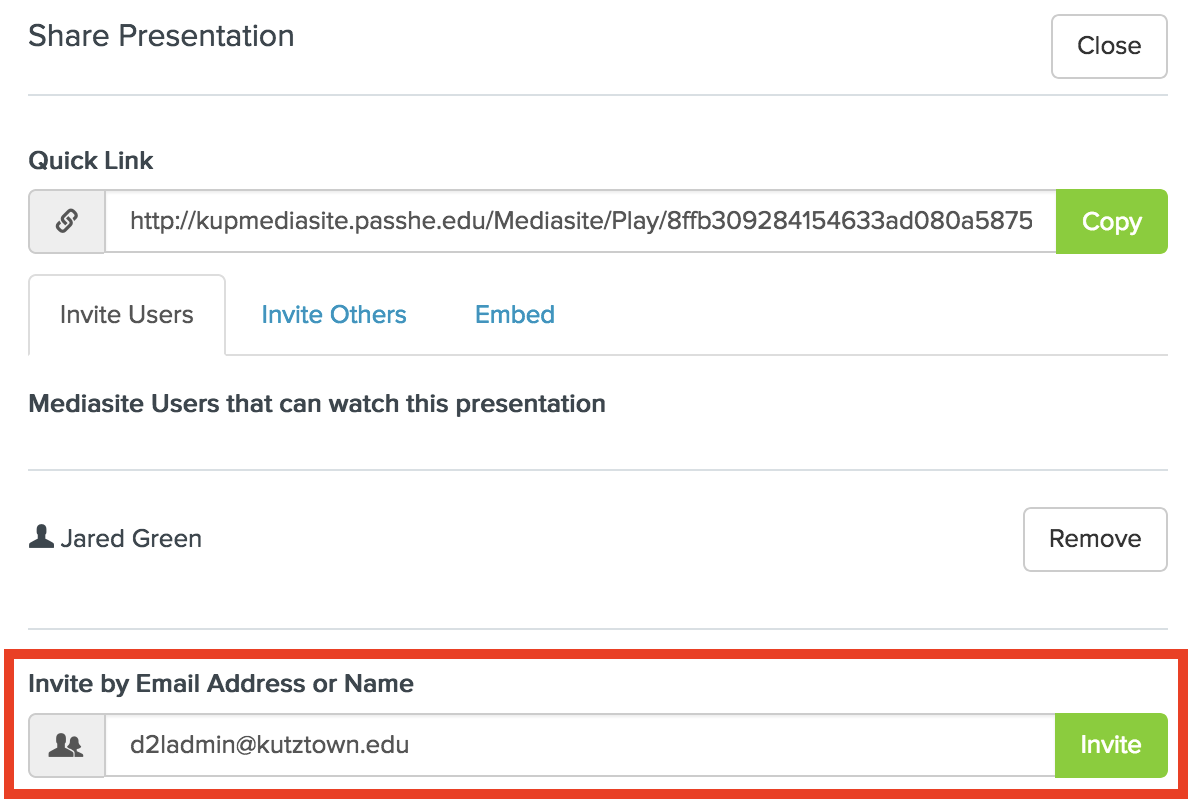 You can also send an email invite to specific individuals right from Mediasite. Enter the individual's email address in the field and click "Invite." The individual will receive an email from Mediasite with a link to watch the video. Please note that this email can be forwarded and anyone from KU with the link to the video will be able to view the video!