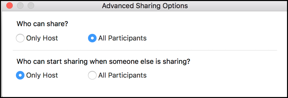 If you choose to let all participants share their screens, it's recommended that you enable "only host" for the second configuration to prevent students from unintentionally starting a screen share while another share is in progress.