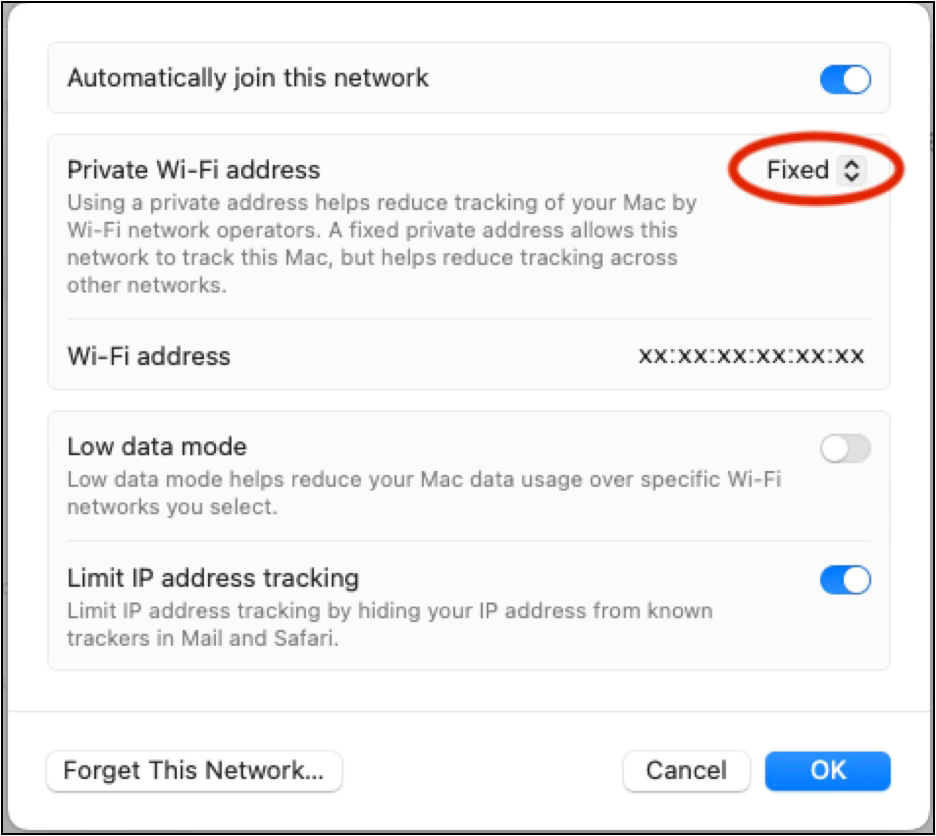 Apple unveiled a "private address" feature in iOS 14 to enhance security. This feature tells the device to use a different, random MAC (media access control) address for each Wi-Fi network it connects to. By default, the private address feature is enabled on devices running iOS 14 or later.