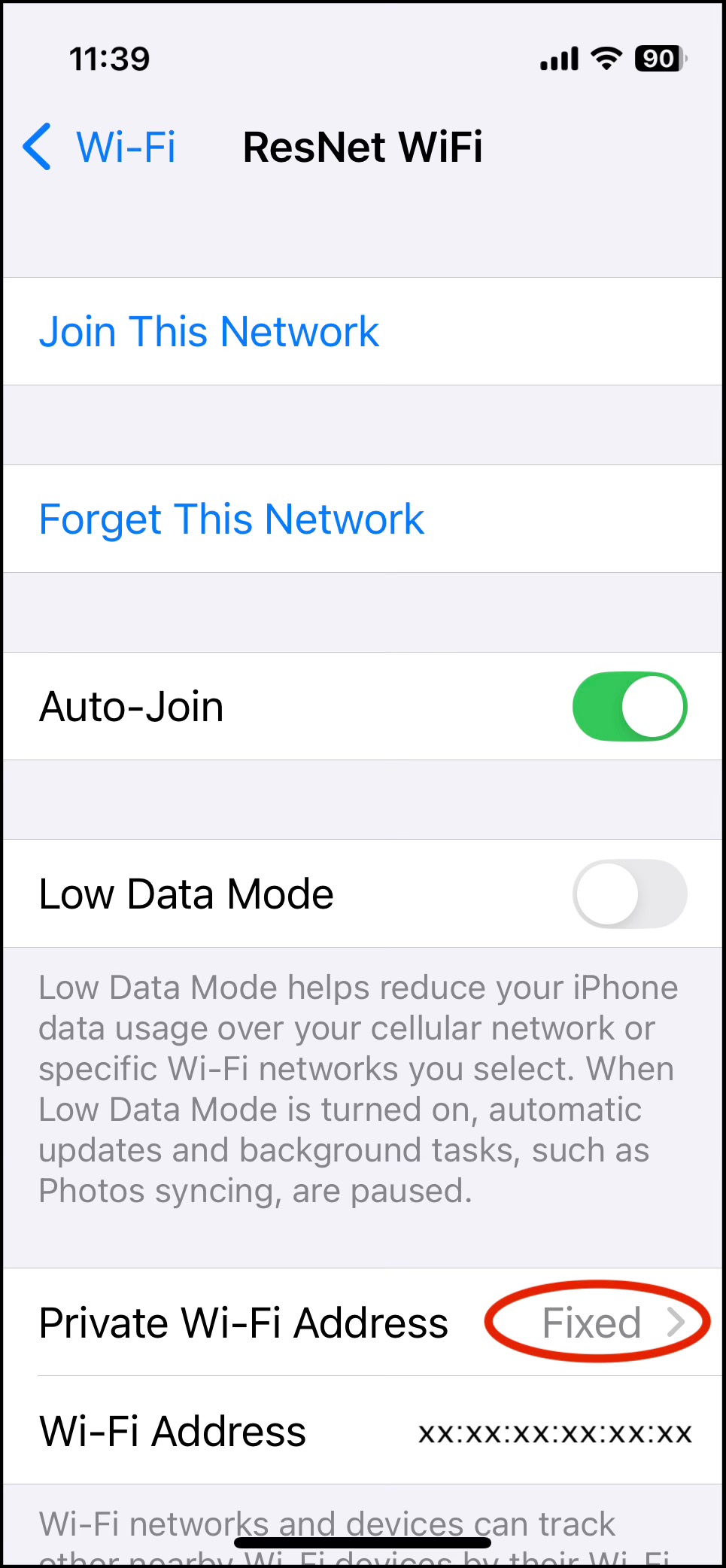 Fortunately you can disable the private address feature by going to Settings -> Wi-Fi -> ResNet WiFi:
