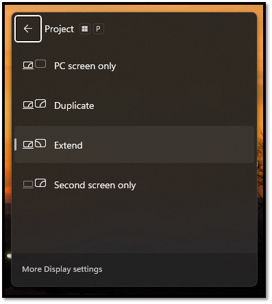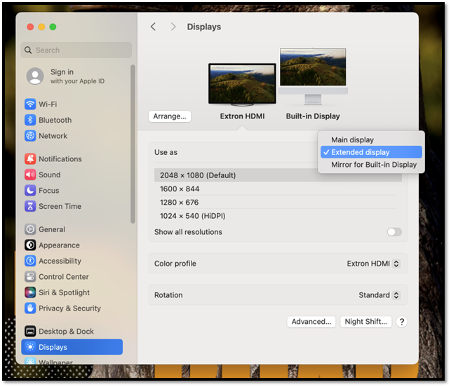 - Select a display in the window (in classrooms, the projector displays as Extron HDMI). Use the dropdown to select Mirror or Extend.