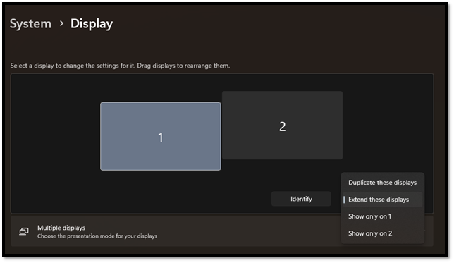 - Click on a display in the main window to view its settings. Use the dropdown menu to select Extend these displays or Duplicate these displays.