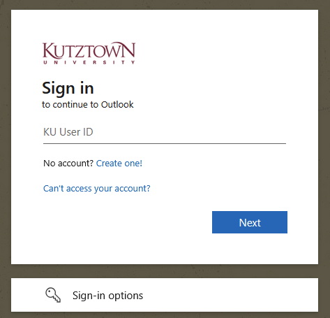 On the Microsoft Sign In screen, enter your Kutztown University email address. Click Next. Enter your password and click Sign In.